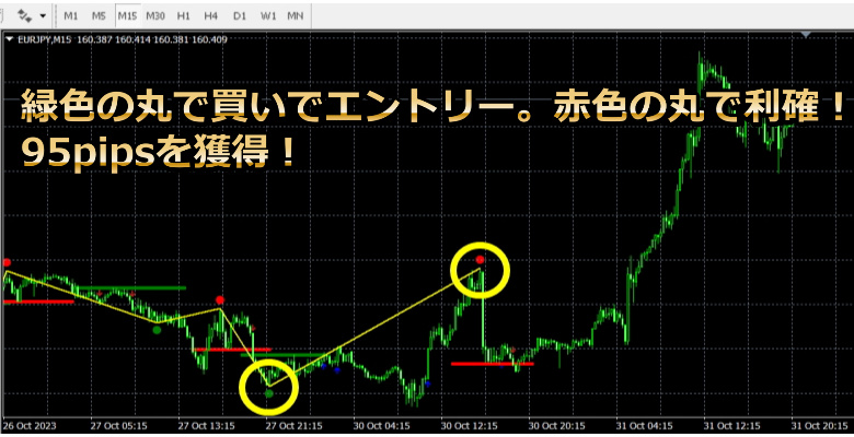 緑色の丸で買いでエントリー、赤丸の丸で利確。95pipsを獲得しました!