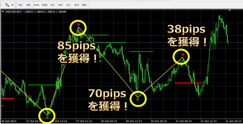 【天底シグナル】1回で2,000pips獲得できるFXインジケーター! 交互に出るシグナル通りにエントリーするだけ!簡単に取引が可能。2023年11月1日の実績