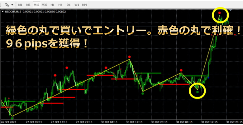 緑色の丸で買いでエントリー、赤丸の丸で利確。96pipsを獲得しました!