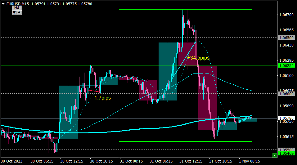昨日は朝のシナリオ通り、1.060付近で押し目を作ったところでロング。いったんは1.0650を上抜いたが、上げ止まり再び1.0650を割ったタイミングでイグジット。+34pips