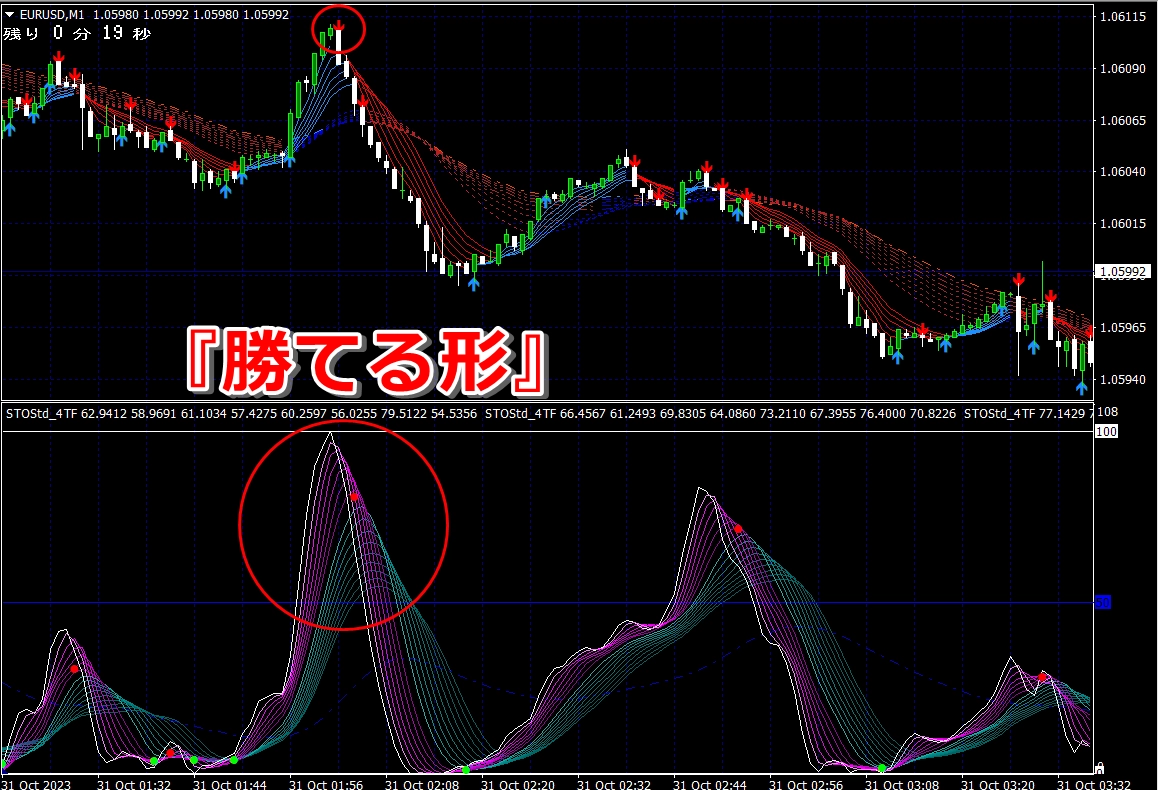 ② 矢印サイン点灯状態で、インジケーターのピンク色の帯が、緑の帯を下からすくい上げるような形状であれば、現在のローソク足が確定する数秒前か確定の直後に1分判定または3分判定でハイエントリーします。