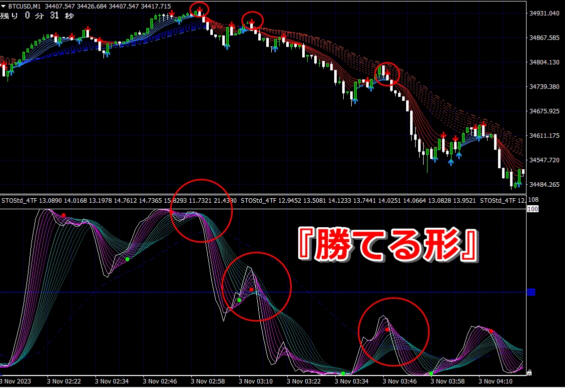 ② 矢印サイン点灯状態で、インジケーターのピンク色の帯が、緑の帯を下からすくい上げるような形状であれば、現在のローソク足が確定する数秒前か確定の直後に1分判定または3分判定でハイエントリーします。