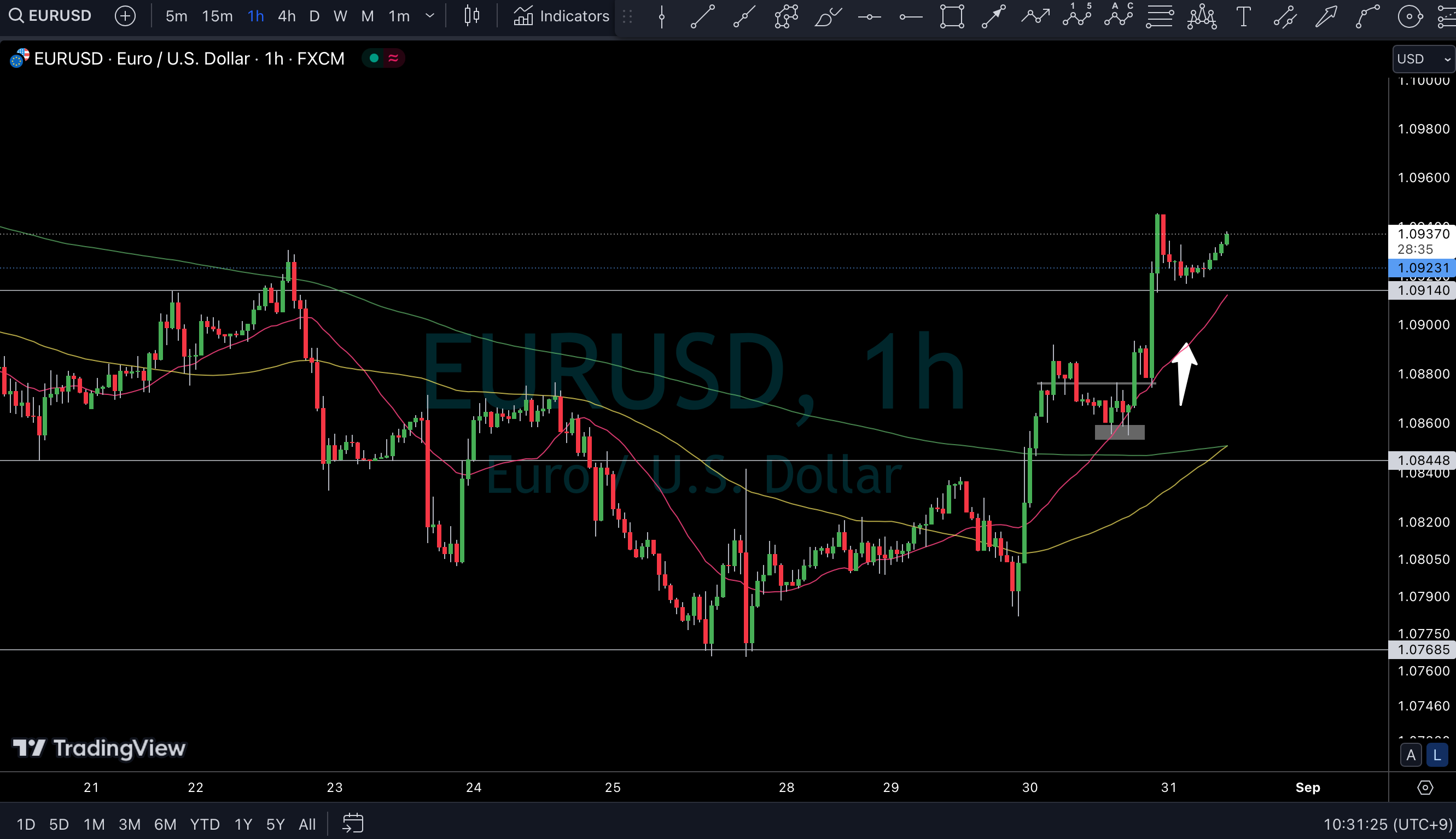翌日は1時間足のma (黄色ライン) が上向いてきて支えられるように上昇継続。ホールド継続。