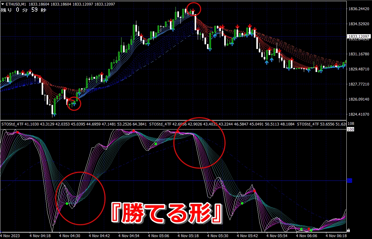 ② 矢印サイン点灯状態で、インジケーターのピンク色の帯が、緑の帯を下からすくい上げるような形状であれば、現在のローソク足が確定する数秒前か確定の直後に1分判定または3分判定でハイエントリーします。