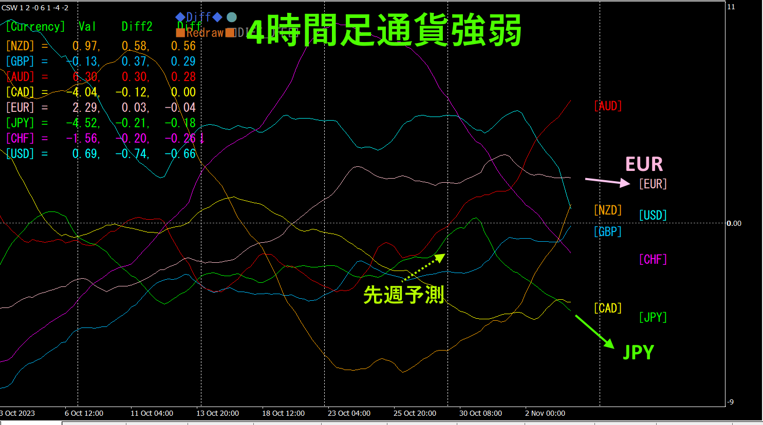 ピンク色がEUR、緑色がJPYです。EURは水平からやや下方向に、JPYは下方向に伸びています。先週の予測では、JPYが上に伸びるものと考えていました。しかし、JPYは週の途中で中折れして、下落しました。結果として、EURJPYは上昇しました。