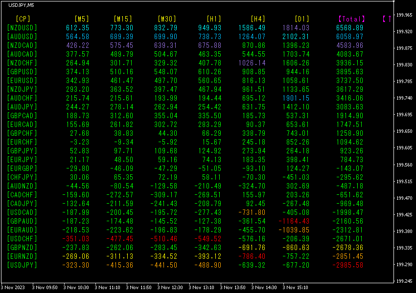 Total数値の降順に並び替えています。最も上の行にあるNZDUSDは、全時間足で青色系の表示色になっていて、Total数値が6568.89と大きなプラスの数字になっています。NZDUSDに大きな上昇トレンドが発生していることを示しています。