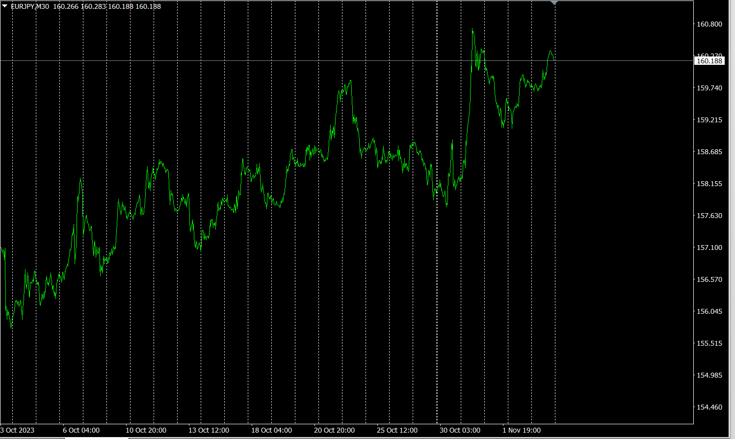 全体の流れを見るため、30分足チャートで直近約3週間分を描いています。