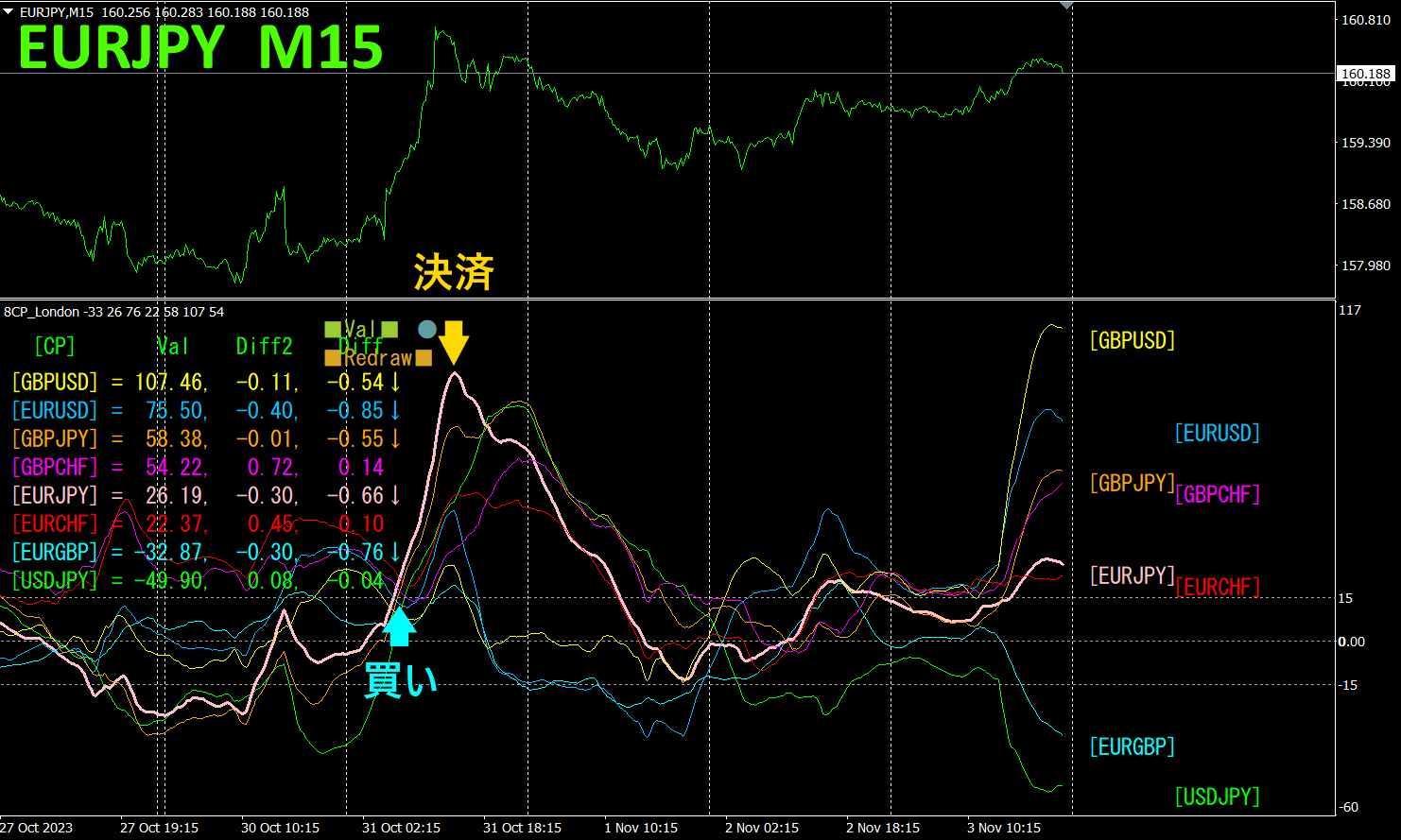上半分は、EURJPYの15分足チャートです。下半分は、「8CP見える化インジケータ」によるものです。ピンク色太線のグラフがEURJPYに相当します。
