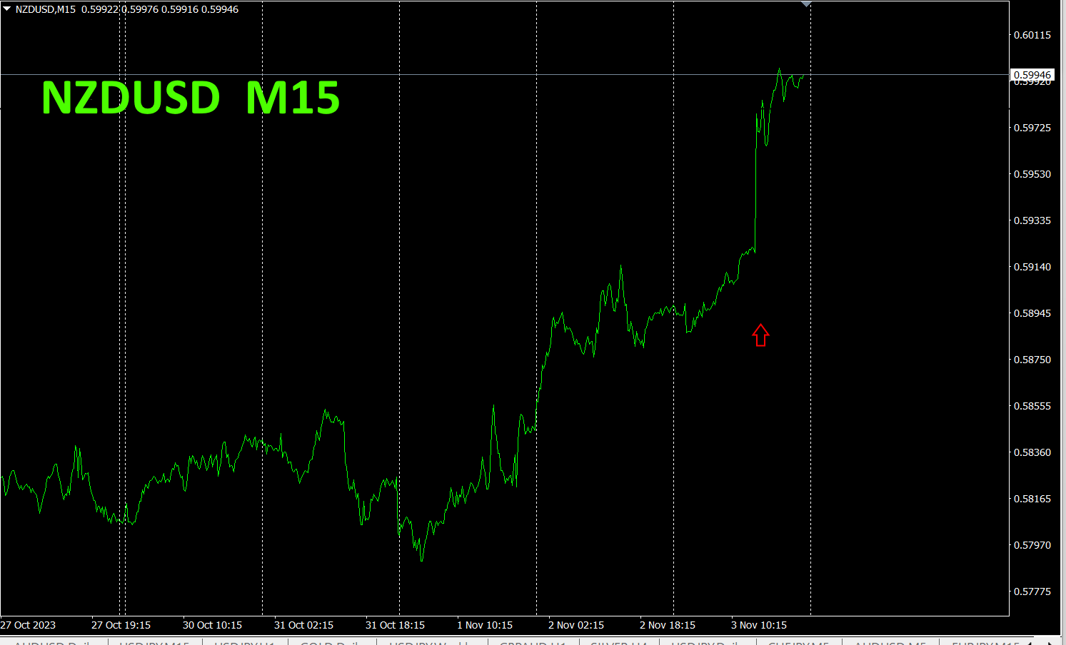 赤色の矢印がスクリーンショットを撮影した所です。右肩上がりの上昇トレンドの途中の急騰部分を捉えています。あまりにも急騰しているので、おそらく指標発表等があったのでしょう。(後で見てみると、米国の雇用統計発表がありました)
