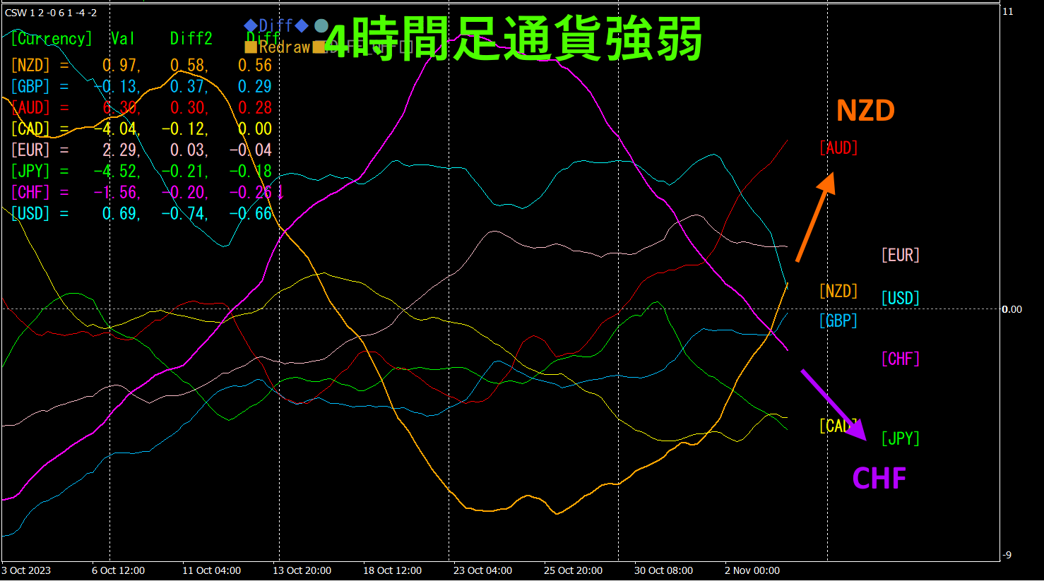 赤紫色がCHF、橙色がNZDです。CHFとNZDは綺麗な逆相関の関係になっています。4時間足通貨強弱チャートを見ると、CHFは急降下、NZDは急上昇しています。今後は、CHFとNZDの乖離が広がっていく見込みなので、NZDCHFはさらに上昇すると予想されます。この状態なら、安心してNZDCHFの買いポジションを持っていられます。ポジションをさらに買い増ししても良いでしょう。
