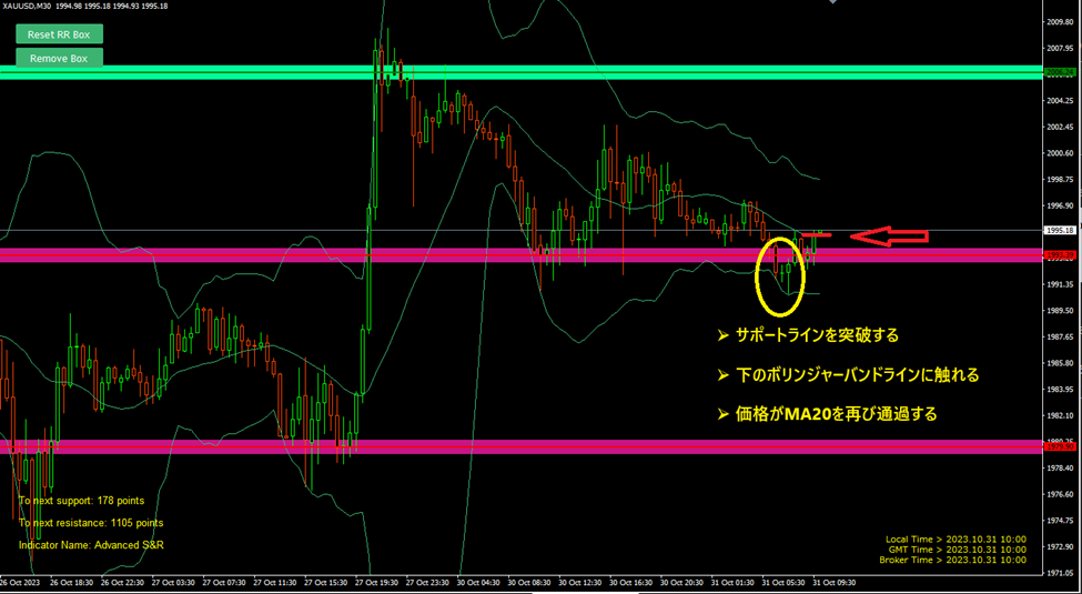 エントリー: サポートラインの上に価格ラインがある場合にのみ買い注文を入れ、レジスタンスラインの下に価格ラインがある場合にのみ売り注文を入れる。