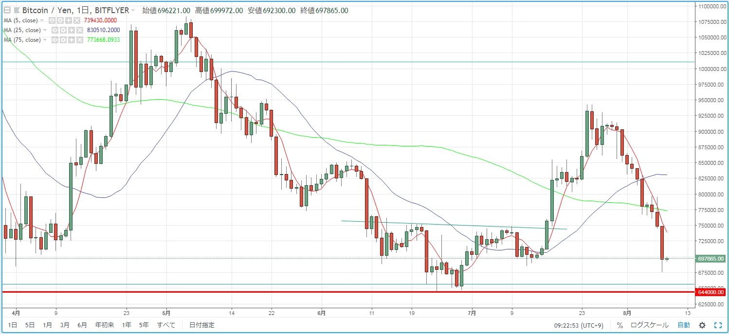 画像は2018年8月9日のキャプチャ。この連載を始めて以来、初となる真紅に染まった画面となりました。メジャーどころでは、リップルとビットコインキャッシュが10%超の下げ。ビットコインやイーサリアムは約6%も下げています。多くの銘柄で、踏みとどまっていた下値抵抗線をブレイクしてしまっています。一体、何が起ころうというのでしょうか。