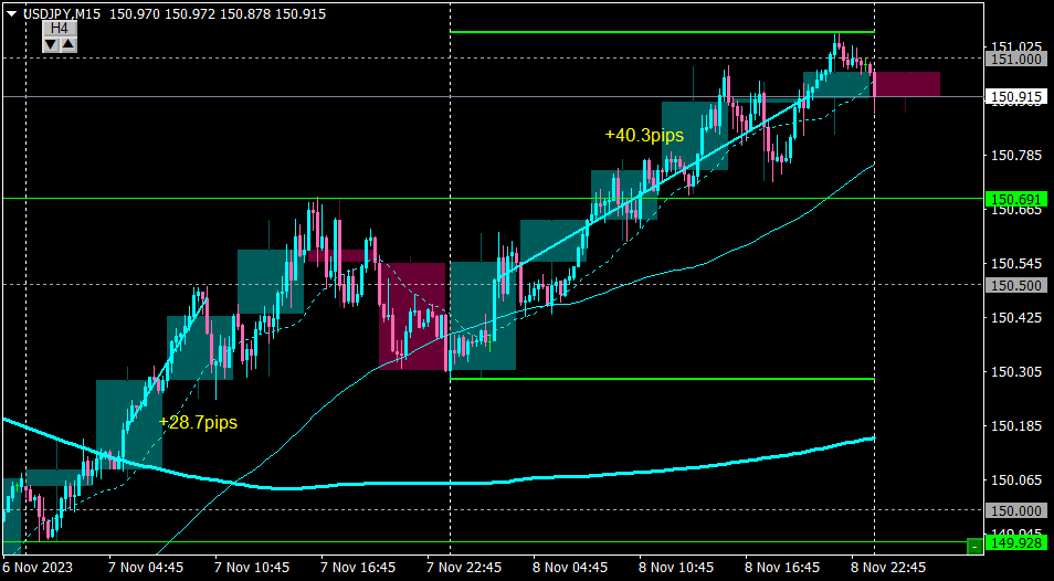 その後、前日高値で少し揉み合ったが、上抜けたのでホールドし深夜にイグジット。+40pips