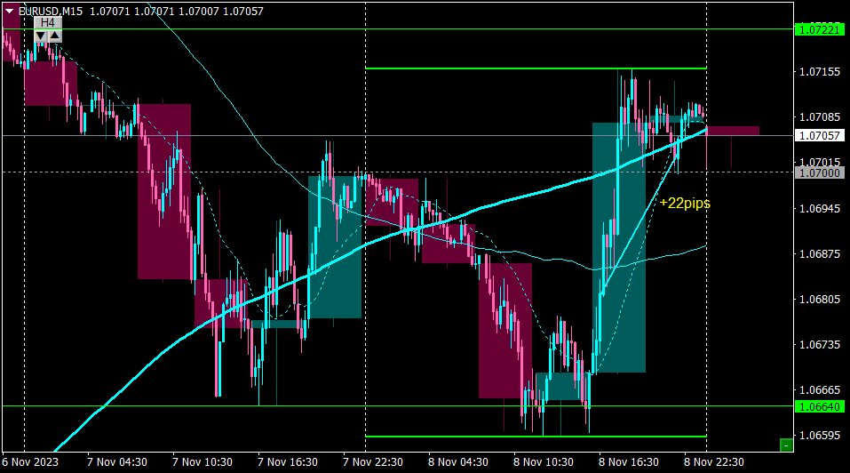 前日安値1.0664で小さなWボトムを作り、23:15のパウエル発言で大きく動き出したところをロングエントリー。+22pips