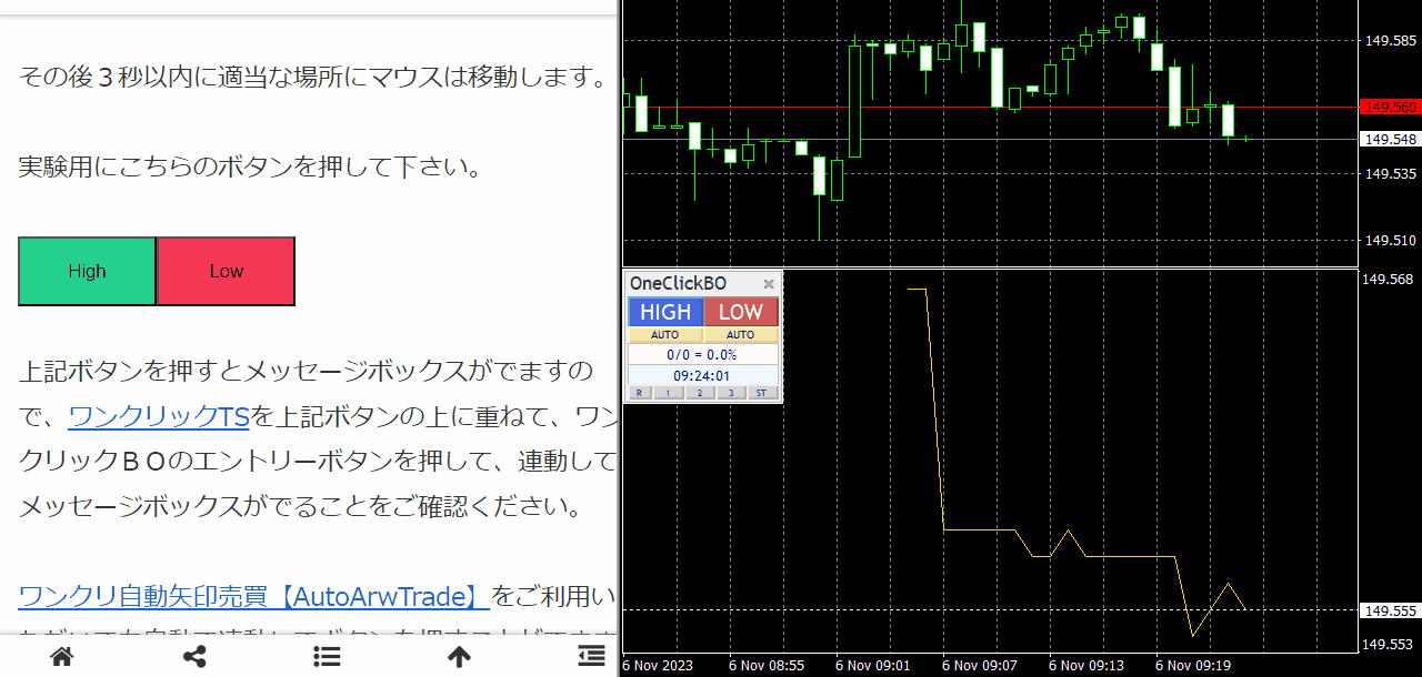 上記ボタンを押すとメッセージボックスがでますので、ワンクリックTSを上記ボタンの上に重ねて、ワンクリックBOのエントリーボタンを押して、連動してメッセージボックスがでることをご確認ください。