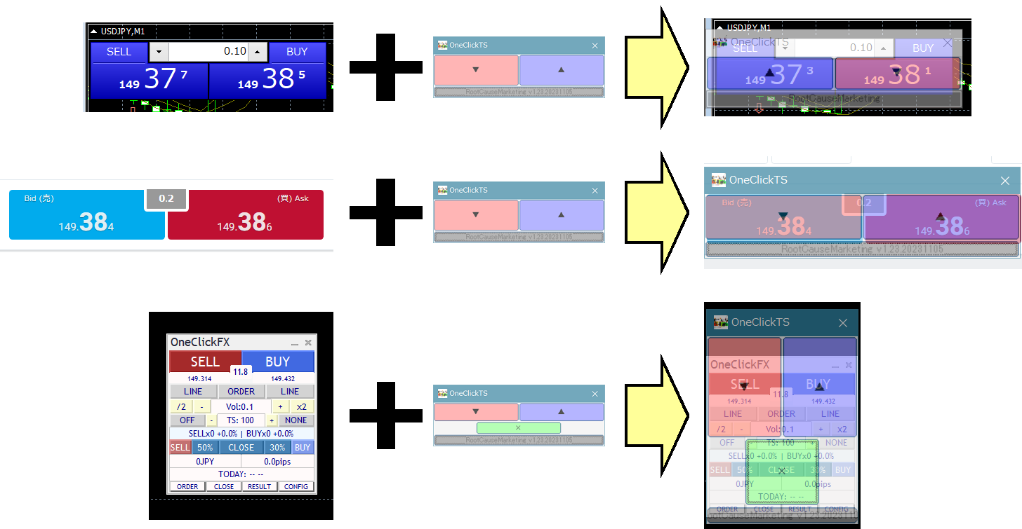 ワンクリックTSを外部アプリやWEBページのボタンにのせて、OneClickTSに対応したシグナルツールの矢印や、OneClickBOやOneClickFX(予定)のエントリーが発生すると、連動してボタンをクリックします。