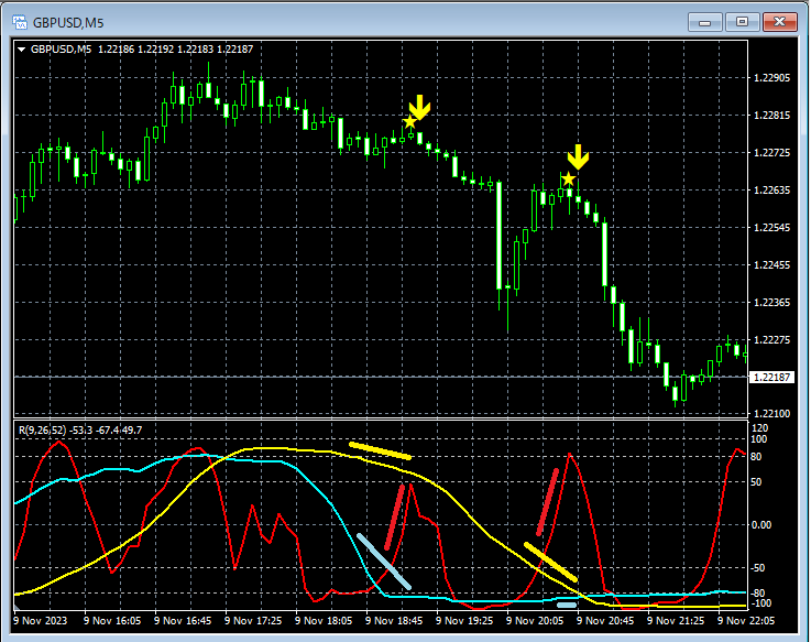 その後、5分足では、mBDSR(フィルター:RCI26とRCI52)の戻り売りサインが2回点灯。さらに下げ。
