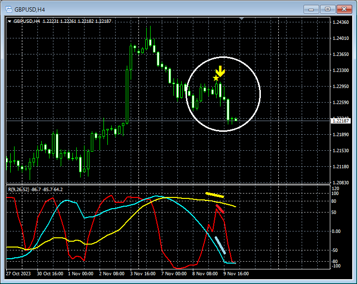 ポンドドルにおける4時間足と5分足のmBDSRの戻り売りサイン