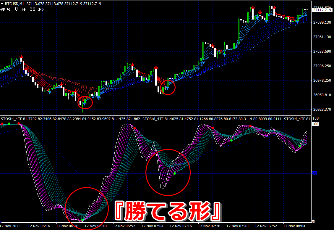 ② 矢印サイン点灯状態で、インジケーターのピンク色の帯が、緑の帯を下からすくい上げるような形状であれば、現在のローソク足が確定する数秒前か確定の直後に1分判定または3分判定でハイエントリーします。