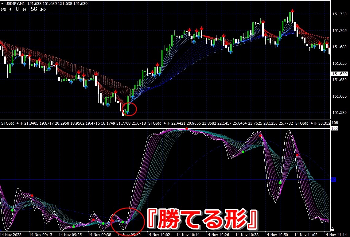 ② 矢印サイン点灯状態で、インジケーターのピンク色の帯が、緑の帯を下からすくい上げるような形状であれば、現在のローソク足が確定する数秒前か確定の直後に1分判定または3分判定でハイエントリーします。