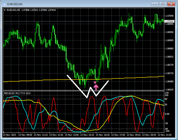 1時間EMA200がサポートとなり、ダブルボトムを形成して上昇。ダブルボトムの右側の谷でmBDSR(RCI2本フィルター)の押し目買いサインが点灯して上昇するよくあるパターン。