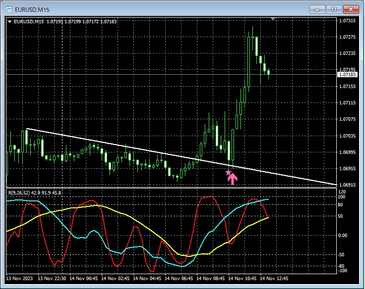 また、この例では、直近安値の少し下にSL(損切り)を置くことなどにより、リスクリワードの高いトレードが可能である。