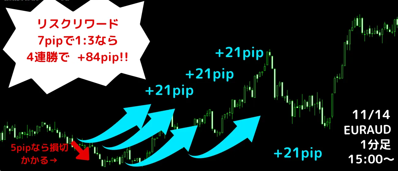 (損切5pip、利確15pip、リスクリワード1:3) 3勝1敗 +40pip 勝率75%