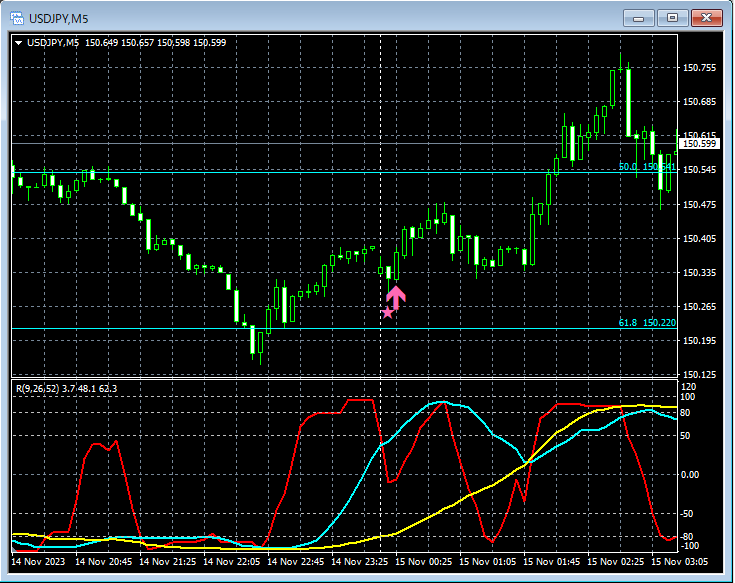 5分足では、mBDSR(フィルター:RCI26とRCI52)の押し目買いサインが点灯。そして上昇。