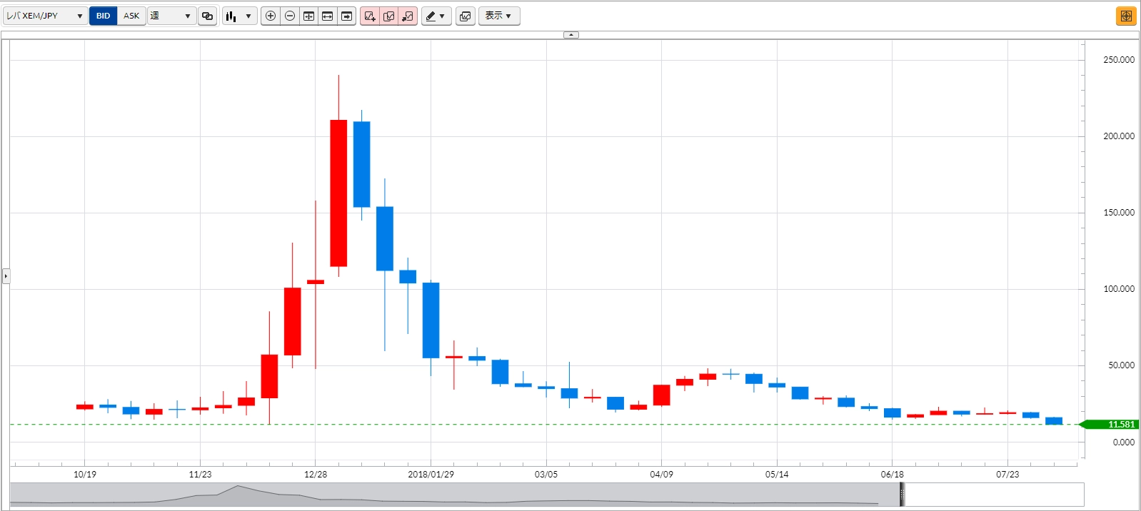 8月5日投稿の「【ETHJPY】サポレジ転換後の展開は?」では、日足の三角もち合いで、下値ブレイクが起こり、約45万円どころで下げ止まれるか、あるいはより下値を伸ばしまうかといったことに注目したいと述べました。実際には8月7日から下げ足を速め、ボリンジャーバンドのマイナス2σに沿って、下値を更新していく強い流れが発生。今年3月27日の安値も更新してしまい、めぼしいサポート候補のない空間へ放り出された格好となっています。バンドウォークが止まらない限り、下値更新が続きます。