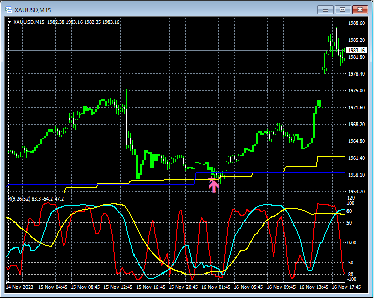 4時間足,15分足ともに、日足EMA21と4時間足EMA21が重なったあたりでmBDSR(フィルター:RCI26とRCI52)の押し目買いサインが点灯。そして上昇。