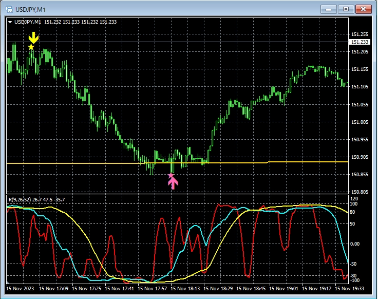 4時間足,15分足ともに、日足EMA21と4時間足EMA21が重なったあたりでmBDSR(フィルター:RCI26とRCI52)の押し目買いサインが点灯。そして上昇。