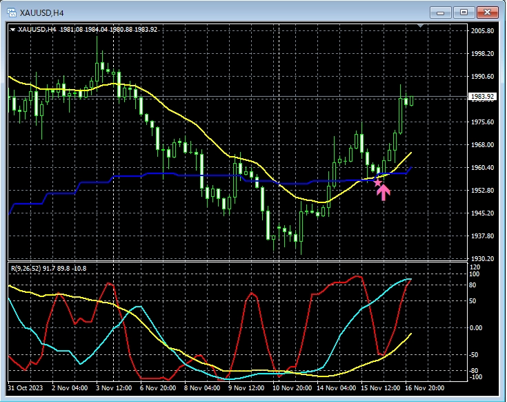 ネックライン付近まで下げたところでmBDSR(フィルター:RCI26とRCI52)の押し目買いサインが点灯。そして上昇。