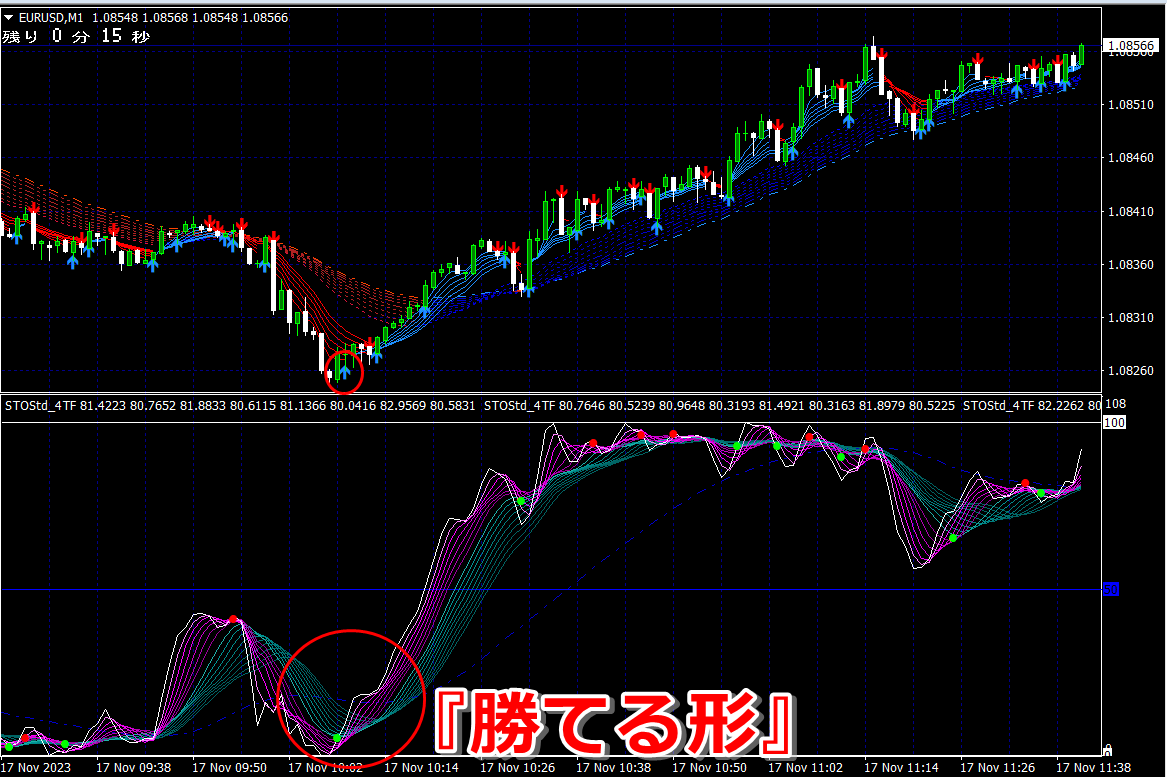 ② 矢印サイン点灯状態で、インジケーターのピンク色の帯が、緑の帯を下からすくい上げるような形状であれば、現在のローソク足が確定する数秒前か確定の直後に1分判定または3分判定でハイエントリーします。