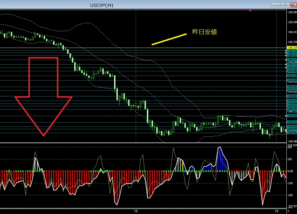 前日安値割れから下落した1分足チャートです。