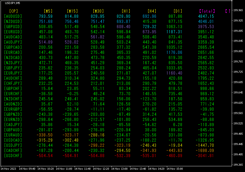Total数値の降順に並び替えています。最も下の行にあるUSDCHFは、全時間足で赤色になっていて、Total数値が-3041.812と大きなマイナスの数字になっています。USDCHFに大きな下降トレンドが発生していることを示しています。