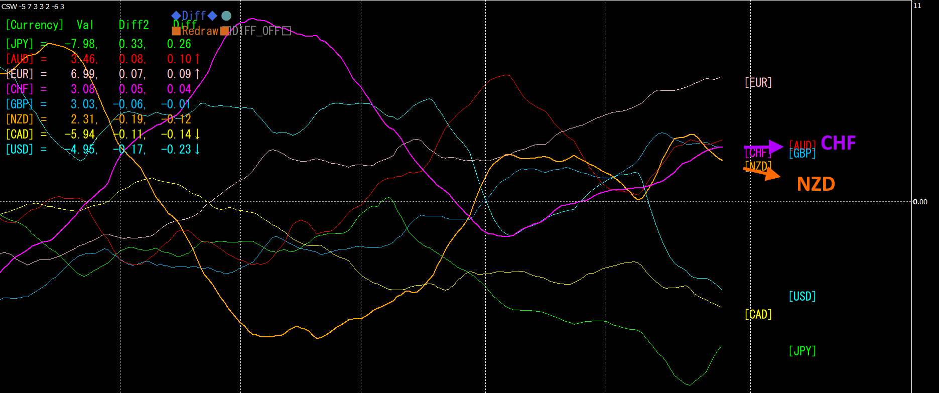 赤紫色がCHF、橙色がNZDです。あまり方向感が出ていないチャートですが、今のところ、CHFがやや上向き、NZDが下向きになっているので、NZDCHFは下落する見込みです。暫く時間を置いて、CHFが下を向き、NZDが上向いてきてから、買いエントリーをすることになります。