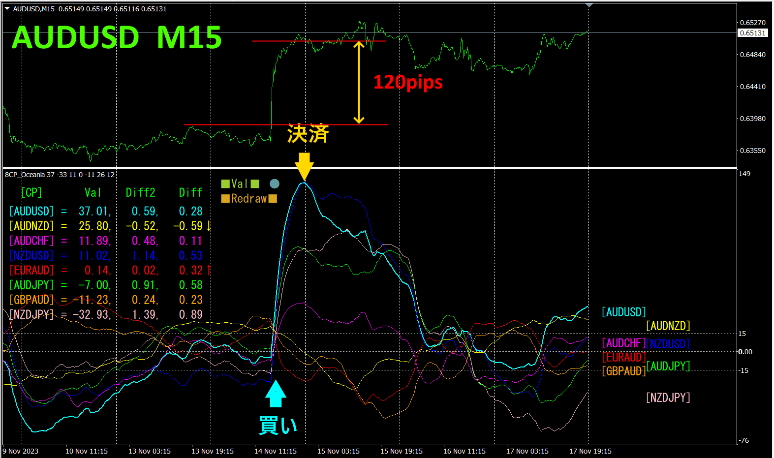 火曜日に、AUDUSD がグラフ群を上に飛び抜けてきたので買いエントリーします。当日、ピークになったので決済します。約120pipsの利益が得られました。「8CP見える化インジケータ」で、最も動きの大きい通貨ペアの乖離/収束する所だけに注目してトレードをすることができます。
