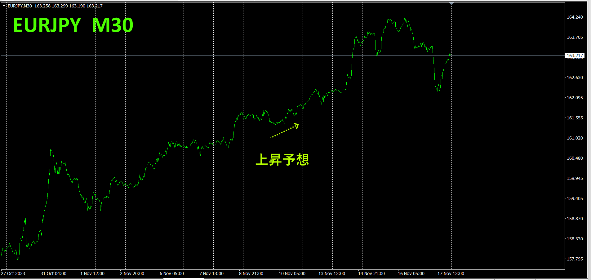 EURは上に伸びていますが、JPYは水平方向です。4時間足通貨強弱チャートの方向性から、EURJPYは上昇すると予想されます。