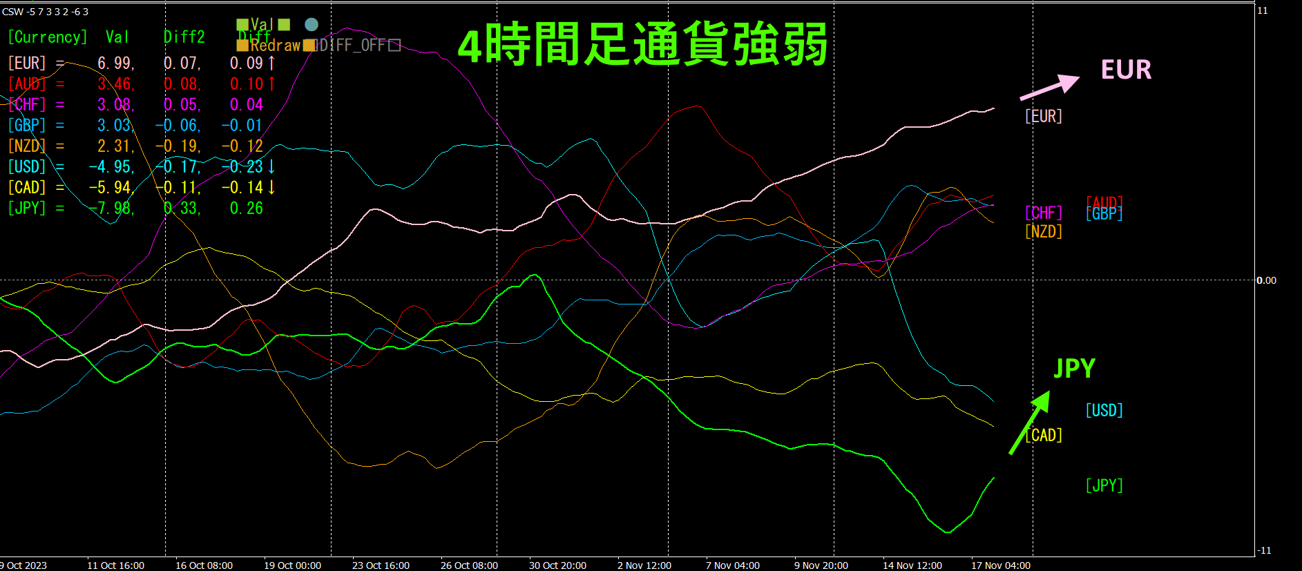ピンク色がEUR、緑色がJPYです。EURは上に伸びていますが、JPYはEURより急角度で上に向かっています。4時間足通貨強弱チャートの方向性から、今後EURJPYは下落すると予想されます。