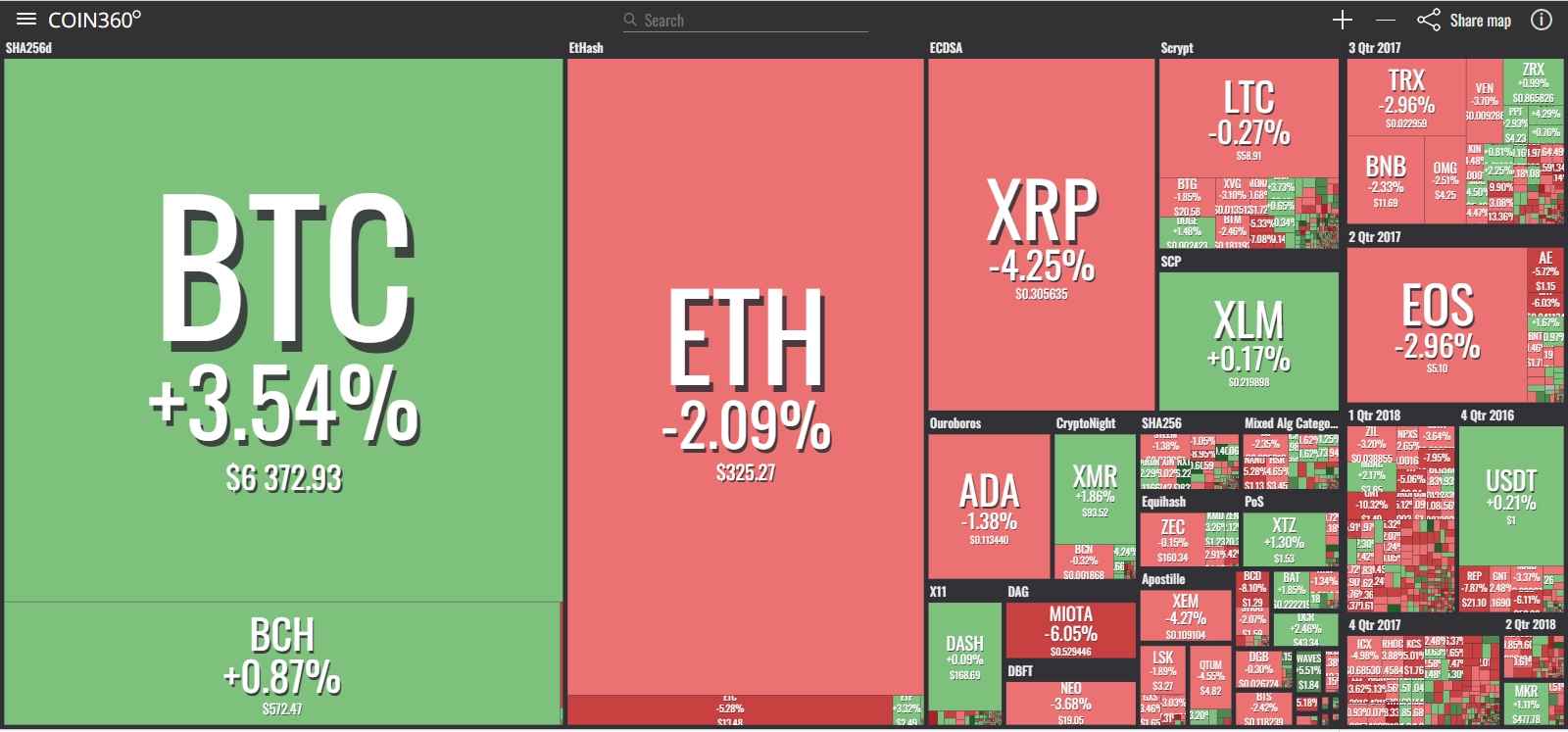 coinmarketcap(コインマーケットキャップ)のサイトから、ドミナンス(各銘柄が仮想通貨全体の時価総額に占めるパーセンテージ)を定点観測していきます。仮想通貨全般が下方向に大きく動き出している相場状況を受け、今回から毎日に更新することとし、仮想通貨業界を俯瞰および転換期を早期に発見することを目的とします。