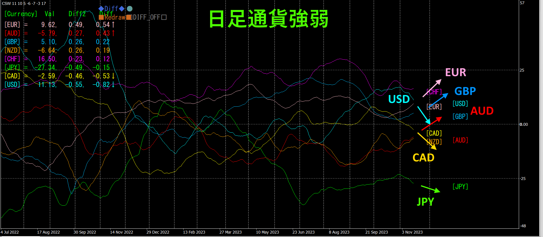 EUR、AUD、GBP、NZDが上向きです。USD、CAD、JPYは下向きになっています。