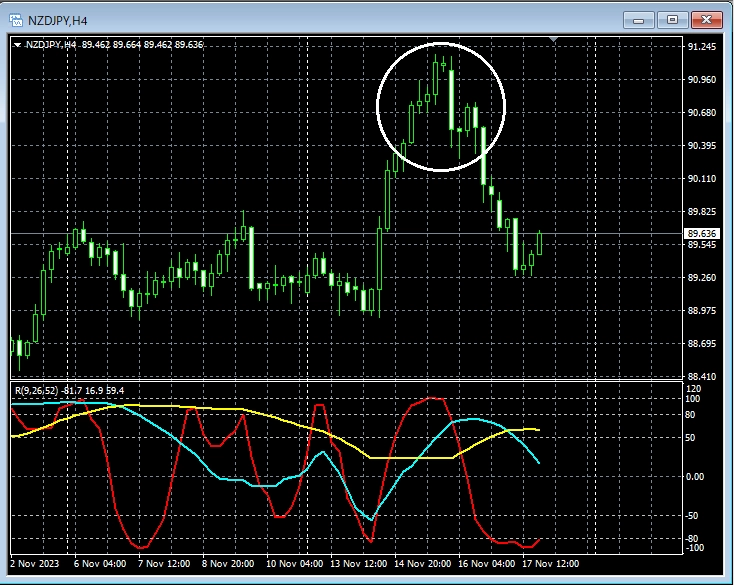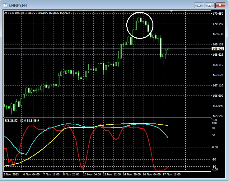 上の4時間足で白い円で囲ったあたりを見ると酒田五法の「宵の明星」が出現していることが分かる。このローソク足のパターンは下降転換を示唆するものであり、下位足で戻り売りを考えてもおかしくない場面かもしれない。