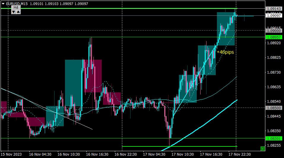 〇前日のトレード・USDJPY ドル円(15分足)昨日は先週安値141.50付近での値動きにとどまったためノートレード。・EURUSD ユーロドル(15分足)昨日は1.090付近でのプライスアクション