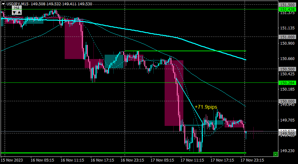 〇前日のトレード・USDJPY ドル円(15分足)先週の金曜は、強いと思われたサポート150.50を割り込んできたので、シナリオ変更しショート。ロング勢の損切りも巻き込んで大きく下げた。+71pips