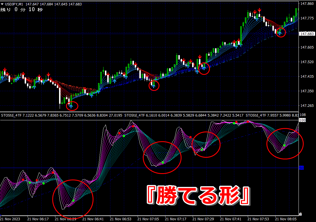 ★ サイン点灯後、ピンク帯が緑帯をすくい上げる形状で必勝エントリー!