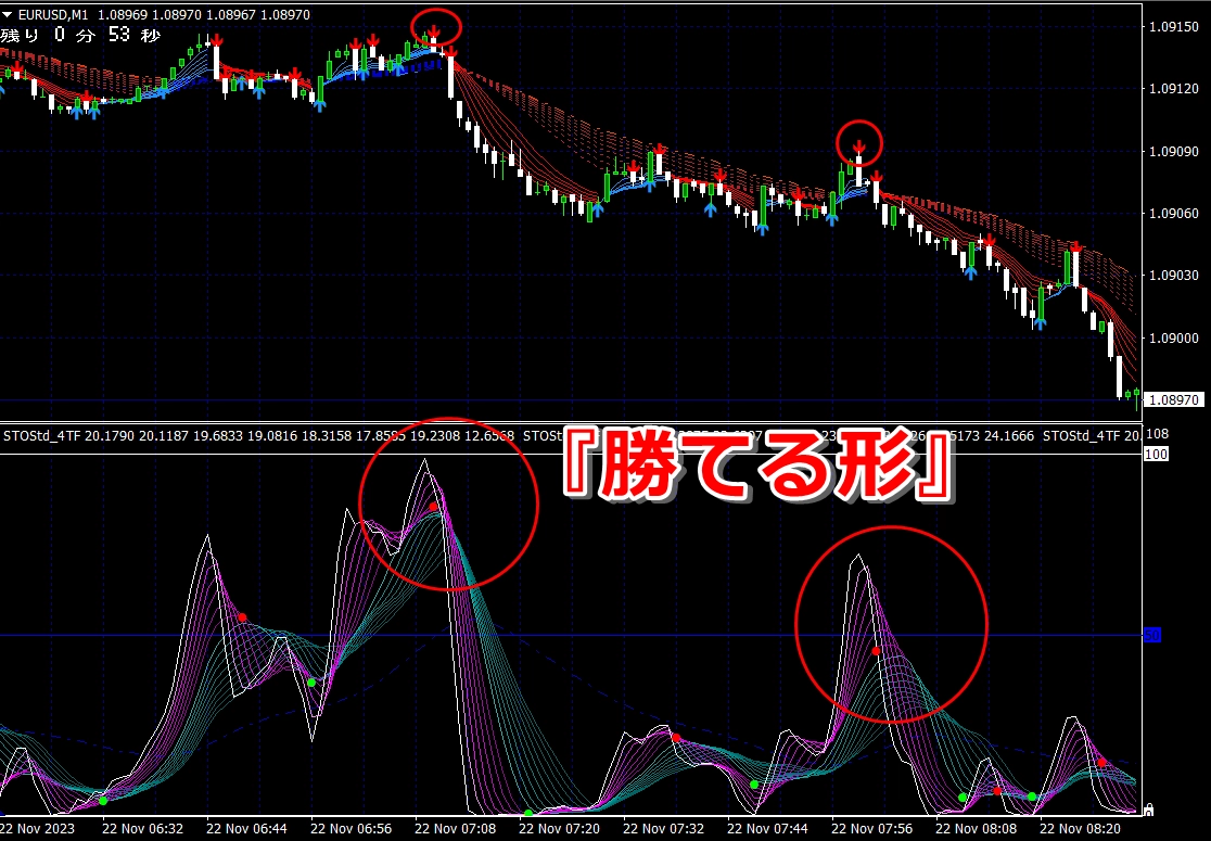 ★ サイン点灯後、ピンク帯が緑帯をすくい上げる形状で必勝エントリー!