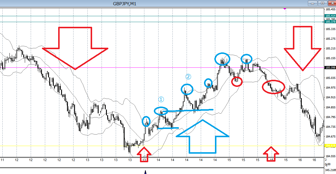億トレーダーのスキャルピングユーザーの皆様は、ご自身のポンド円1分足チャートをご覧ください。