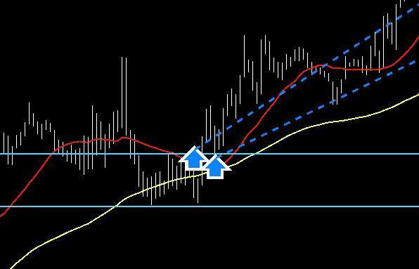 4時間足、maに支えられてダブルボトムで下げ止まり上昇継続