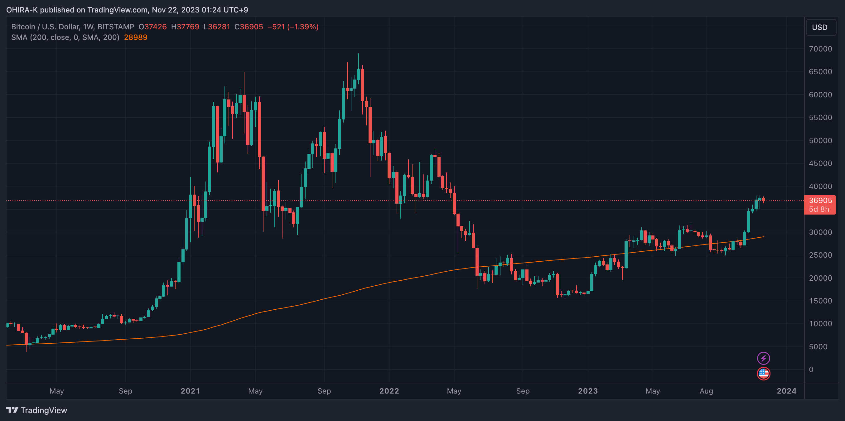 先週と同じ考察ですが、週足でみたときに、今の価格帯は2021年からの上昇相場で何度も価格が衝突しているゾーンの価格帯です。
