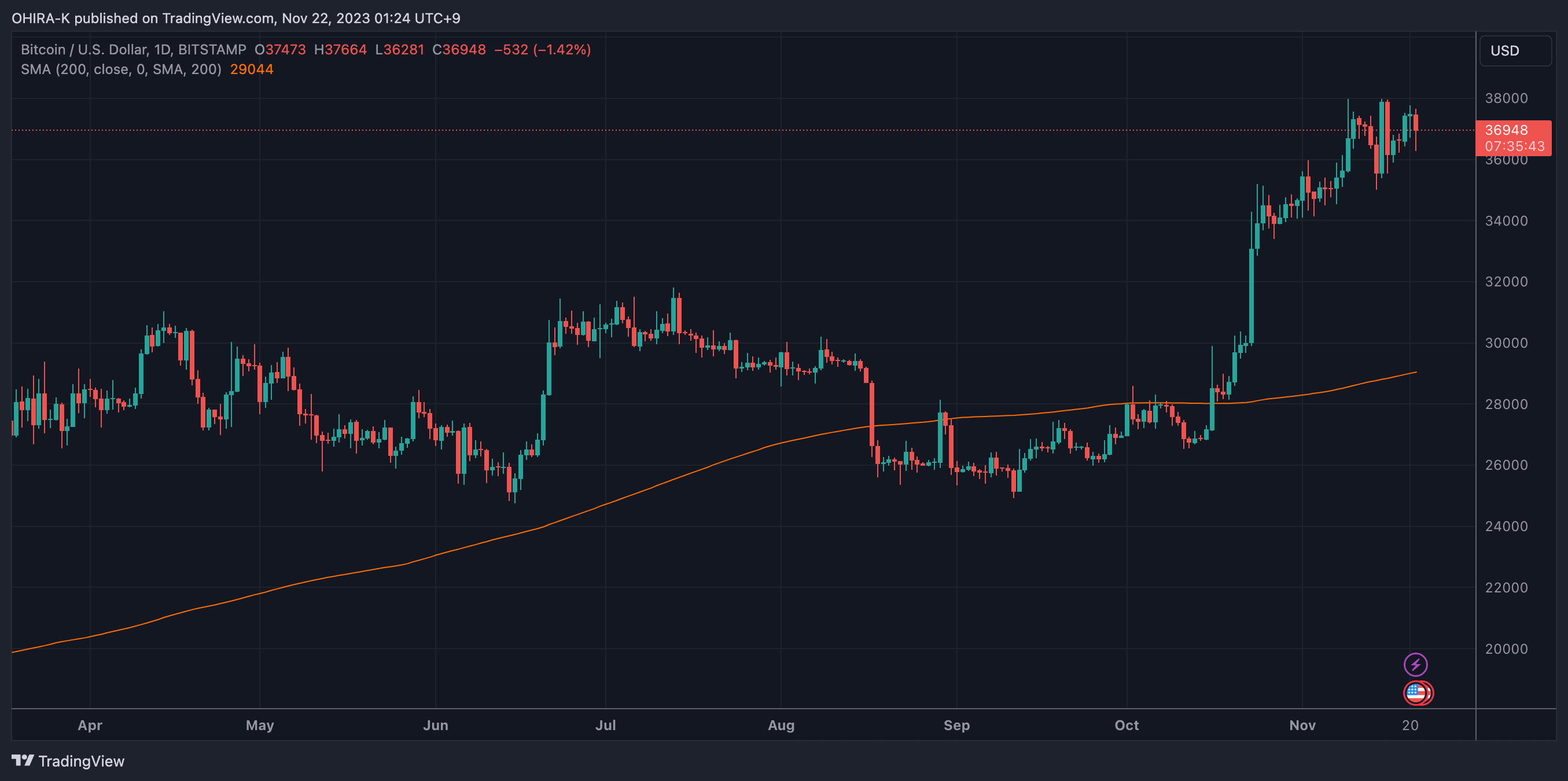 直近で赤のローソク足がでていますが大きい下落ではなく25000ドルからの上昇に比べると下落を耐えている印象を受けます。